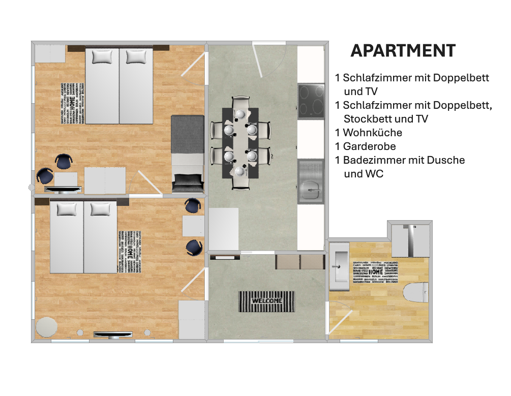 Unser neu renoviertes und liebevoll eingerichtetes Apartment mit 76 m² bietet Platz für bis zu 4 Erwachsene und 2 Kinder.